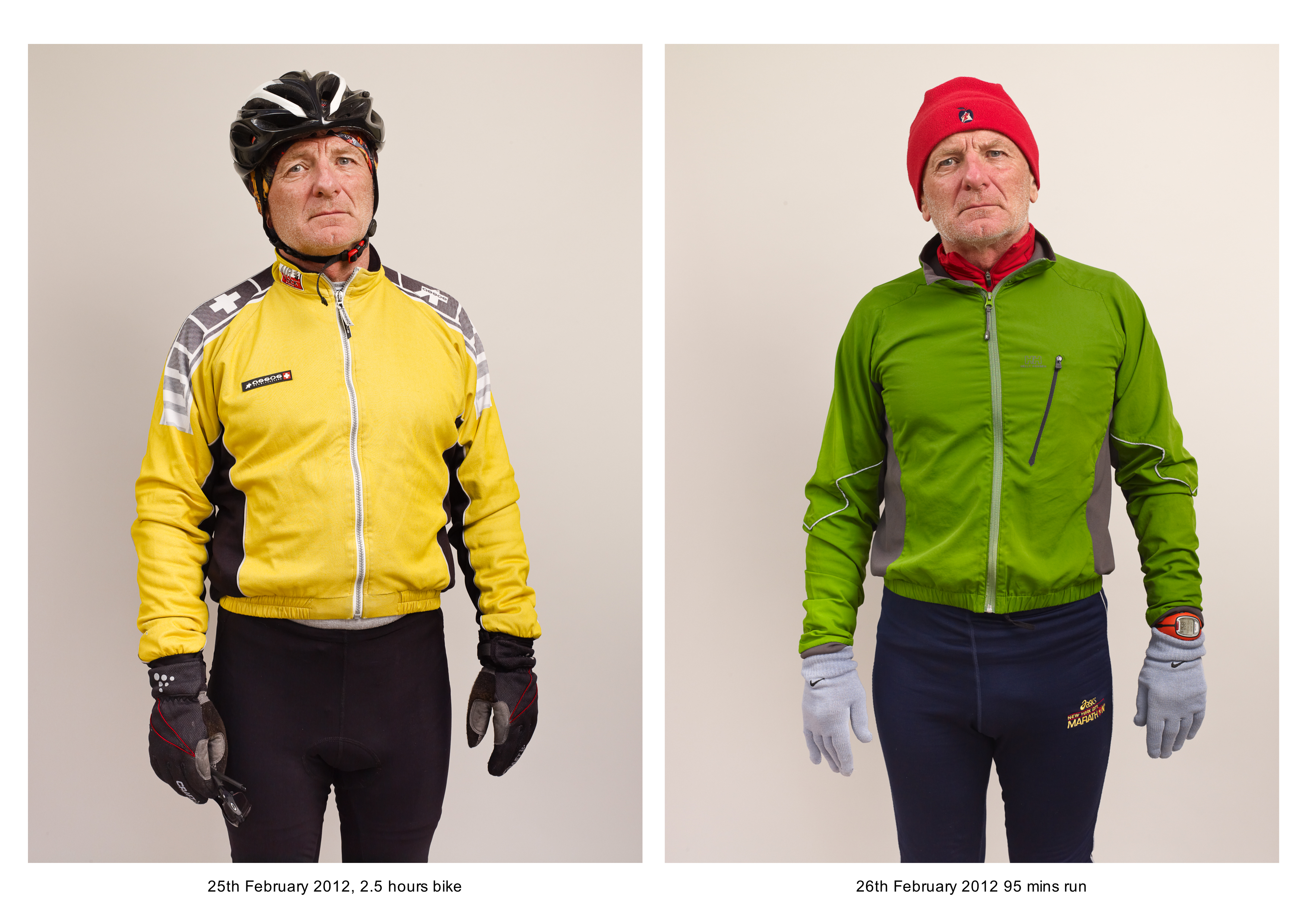 I have been thinking about this project and will probably try a few different alternatives to see how the photographs shape up. My first thought is that this might be an extension of the main ‘I am an Ironman’ project. I would make a series of portraits of myself immediately after key workouts during my ironman training build-up. I would still be dressed in my training clothes. I would do this over and extended period, specifically the timeframe of training for Ironman Germany which takes place in early July. Over this period the results of the training may become visible (i.e. I become leaner and fitter) and certainly the change from winter to summer clothing would be immediately apparent. I could add a caption to each image indicating the date and nature of the workout.