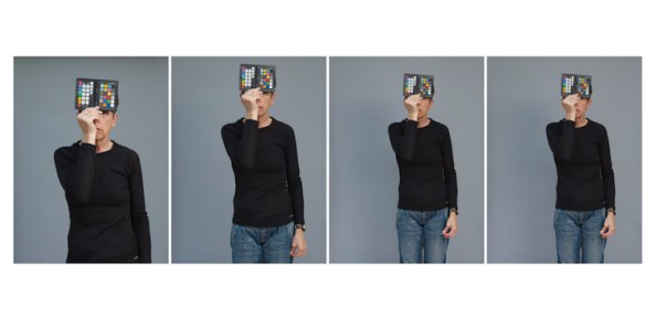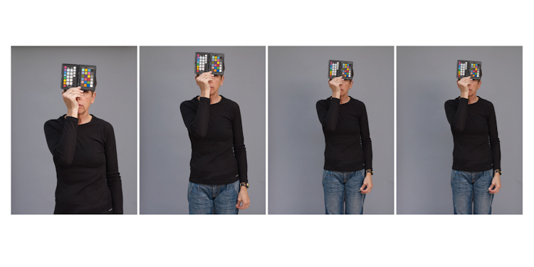 Whilst I am happy to accept that the background lighting will vary, I obviously want the skin tones of the subjects to be to a consistent and realistic standard. I have decided to use a device called Colorchecker Pro to assist with this. This tool has a grid of squares with different colours and tones. In particular it has a set of squares for portrait photography, ranging from cool to neutral to warm tones. By taking a test photograph of the setup for each portrait with the Colorchecker Pro in the frame, it is possible to ensure a consistent white balance for each portrait. This is effected by clicking Lightroom‘s white balance eyedropper tool on the same square of the Colorchecker Pro each time. The photographs below show the effect of using the tool on the neutral setting.