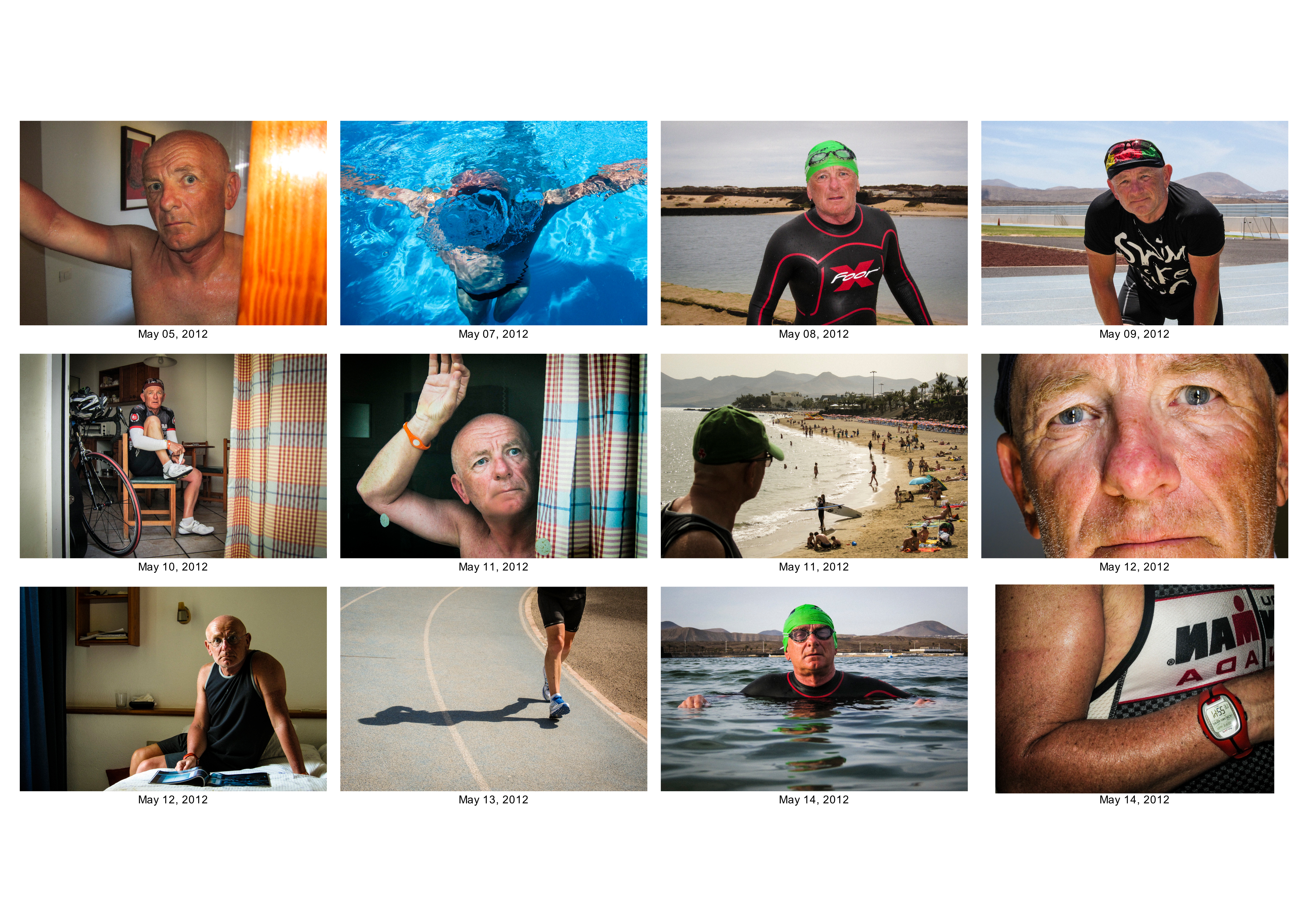 Before setting off for my recent trip to Lanzarote my tutor Jesse suggested that I might make a documentary piece of my experiences. He intended that I undertake an autobiographical piece. Sadly I misunderstood his idea and produced a set of photographs based on self portraits. When making the images I had in mind the self portraits which punctuate Nan Goldin’s work. I was trying to convey how I felt at stages during the three weeks I was there. The three weeks involved intensive training for my next triathlon race in Germany in July.