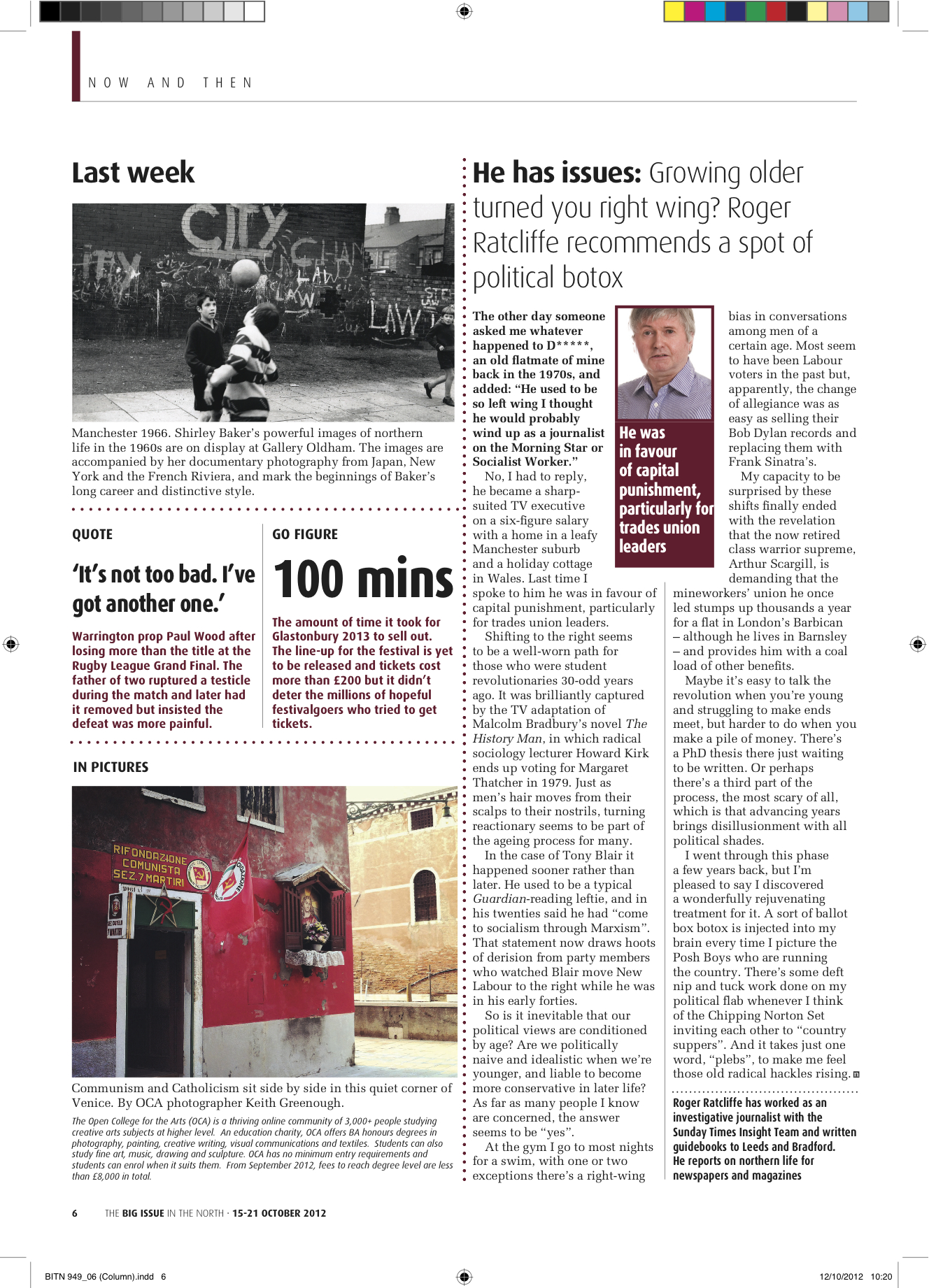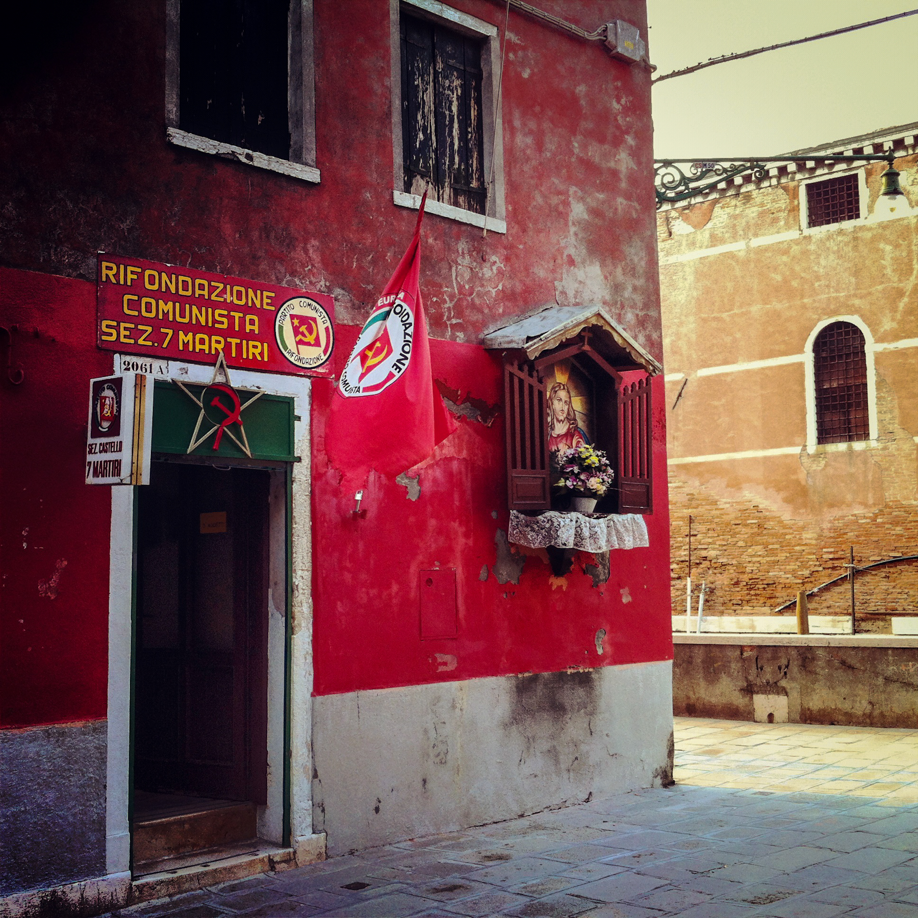 One of the iphone photographs from Venice has been published in Big Issue of the North. It is a photograph of the Communist headquarters which has a religious shrine alongside the doorway into the office…it grabbed attention because it could be read as suggesting that the politicians might needs divine intervention to overcome the current economic difficulties in Europe!! Just goes to show that spending lots of time thinking and talking about photography equipment and technique may be missing the point. With documentary photography what really counts is the information conveyed on both a denotive and connotive level. Here is the photograph…