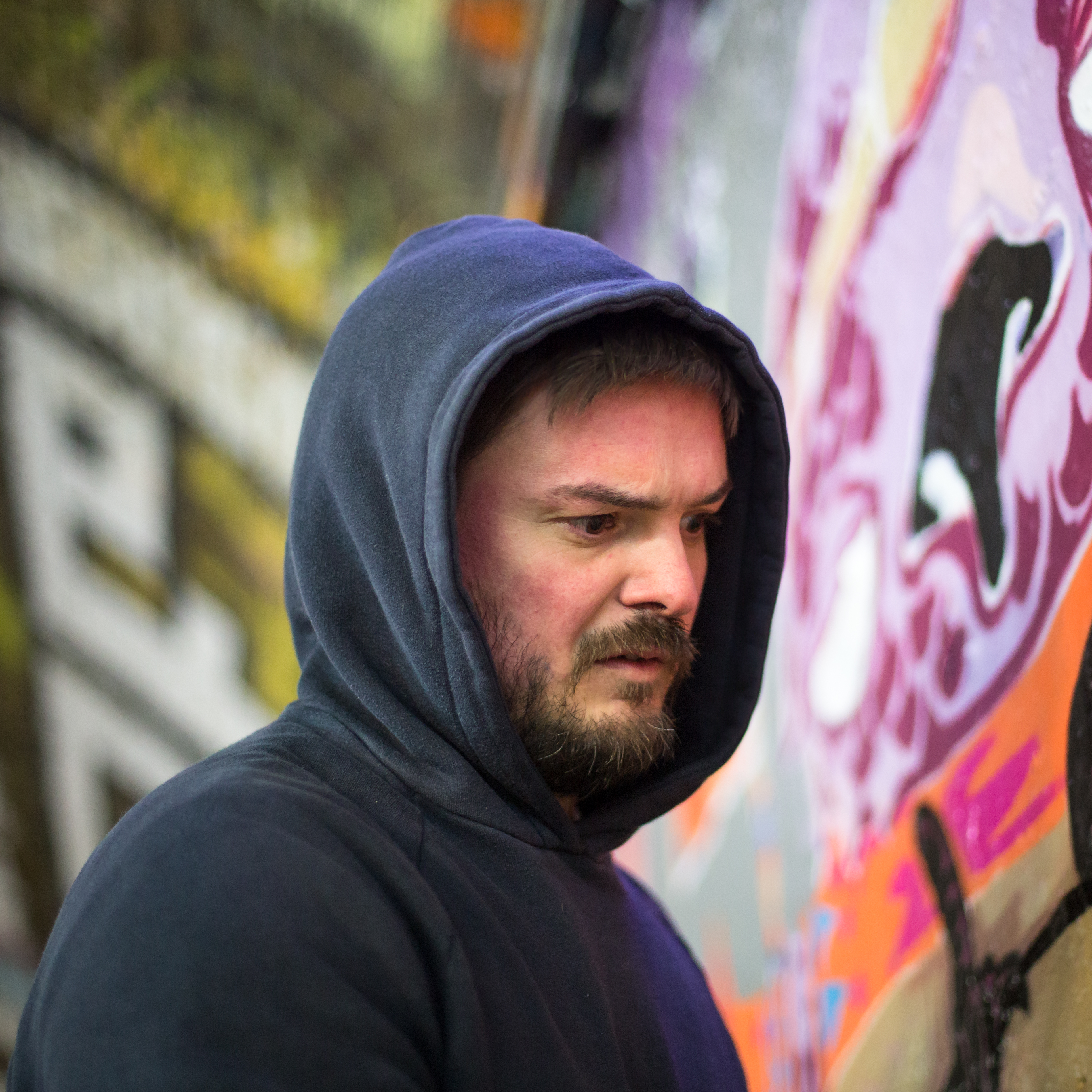 The lighting at the Boxpark was if anything worse than at Leake Street. It was dark by now and so their was mixture of tungsten, coloured lights and fluorescents. Once again I was surprised to capture an image which I feel will work for my final set, as it meets my selection criterion of showing the concentration of the artist and in particular the focus of their eye(s) on their work. It goes without saying that the lighting, composition and image quality should be strong. Another consideration is how well it fits into the sequence for the final video. One of my considerations here is the placement of the artist’s head in the frame. Here I have been looking to create interesting transitions from photograph to photograph by moving the focus of interest (i.e. the artist’s face) around the frame. Here is the second image: