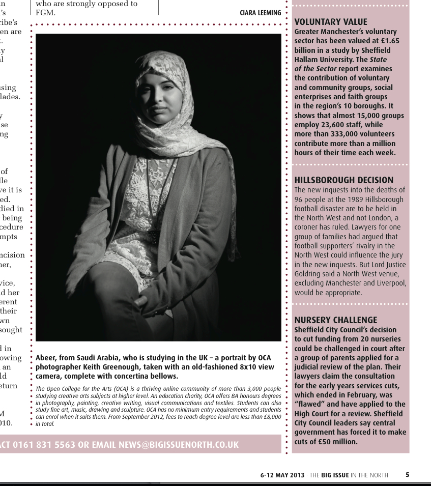 My portrait of ‘Abeer’ made with an 8×10 camera during my course at Camberwell College of Art has been published in the Big Issue of the North. Abeer kindly gave me her consent to use the photograph. Here is the clip from the magazine.