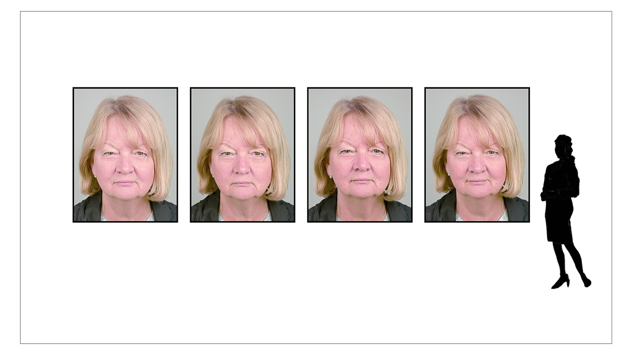 The basic idea is to produce four portraits for each subject, to be presented side by side in a horizontal row. This style of presentation alludes to the format produced by studio photographers for passport photographs. The passport authorities require everyone to supply several identical portraits, apparently to avoid any ambiguity. But how do people decide which image out of many is the right one? In practice the process is somewhat random. It is the arbitrary nature by which a passport image is chosen, and by inference the way we are identified, that I want to explore.