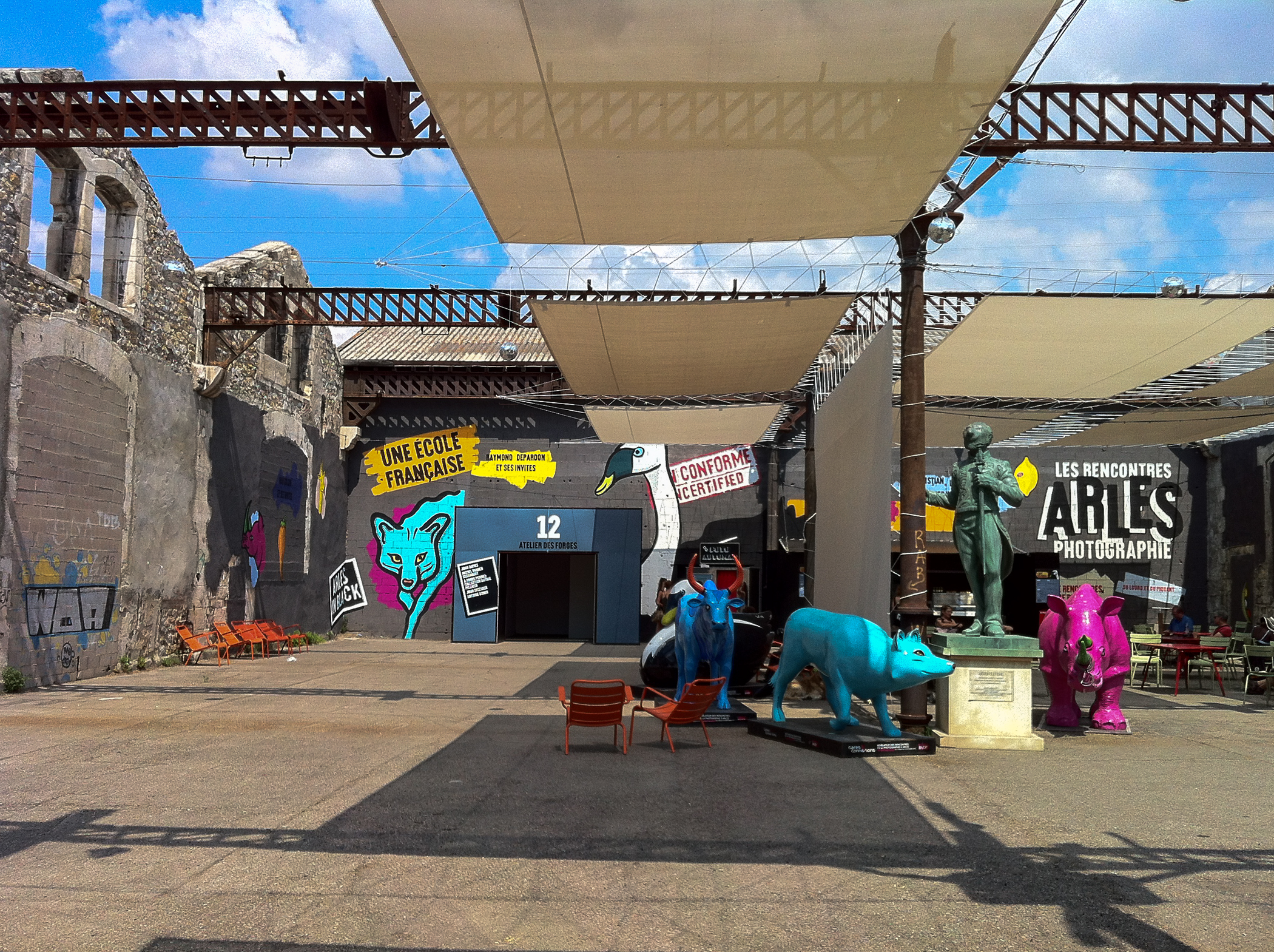 I used half a day to plan and orientate myself. The venues are spread all over the town so it was very necessary to plan a route around. The Rencontres Arles iPhone app was a very useful guide/resource but walking about to figure out the lie of the land was a good idea. The exhibition sites are grouped into two main areas – the old town centred around the Hotel de Ville and the Parc d’Ateliers (15 minutes walk from the centre). In the old town many of the venues are beautiful churches and civic buildings, including the Espace Van Gogh which was originally a hospital (where Van Gogh was taken minus an ear). The ‘Ateliers’ are quite literally abandoned workshops on an old industrial site.