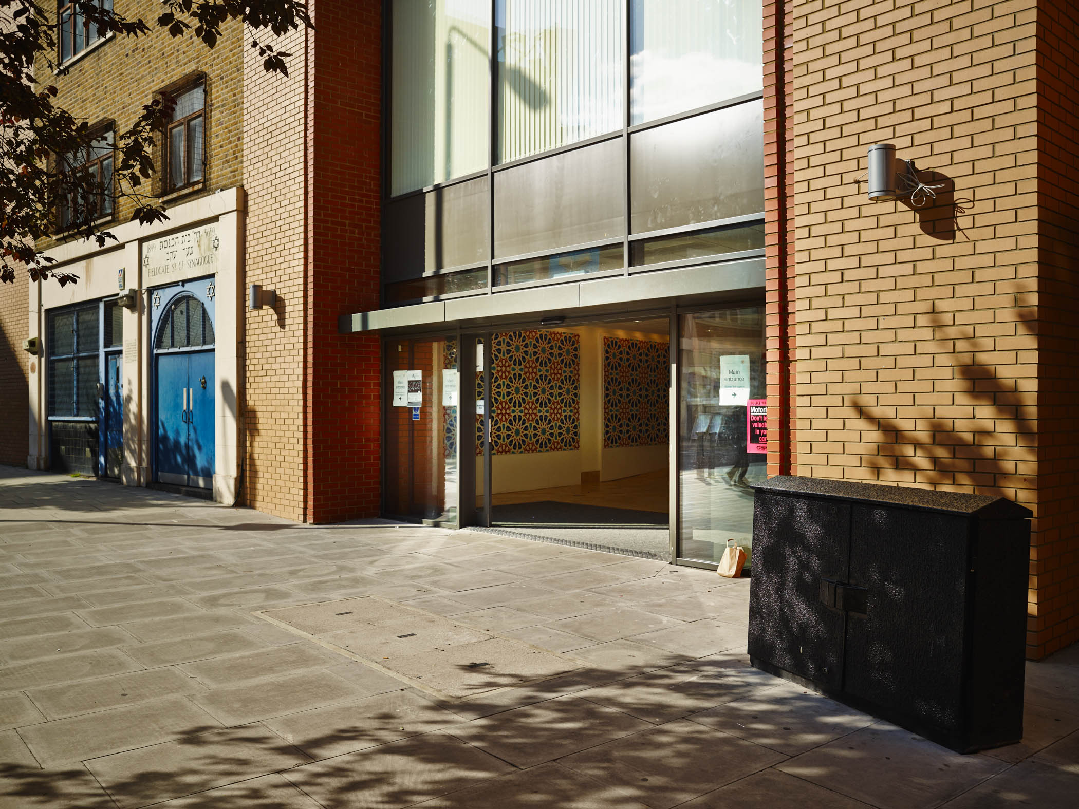 My next port of call was Whitechapel where I visited Fieldgate Street. Here the huge East London Mosque stands next to the diminutive Fieldgate Street Synagogue (now ‘temporarily’ closed). My idea was to try and show how the balance of the population in the area has moved from Jewish to Bengali. This could be a bit obvious, but if I can capture an interesting image could be worth pursuing. The front entrance to the synagogue and the rear entrance to the mosque are next to one another on Fieldgate Street. It is very difficult to compose an image as the street is very narrow and when I was there it was very busy. This is the best shot I made…I will go back early in the morning to explore other possibilities. My plan would be to show the synagogue/mosque image next to text which would be a transcription of the closure notice for the synagogue.