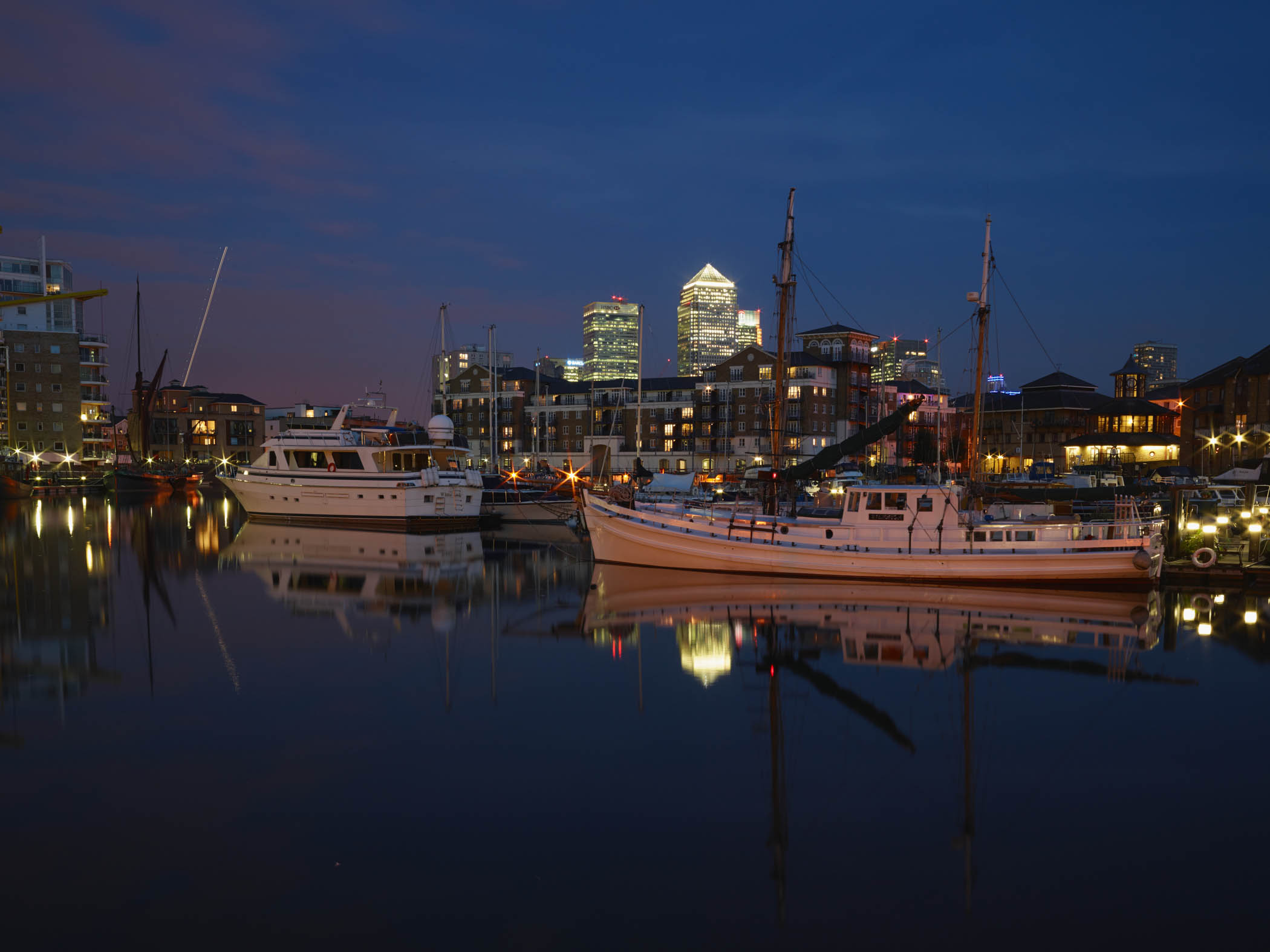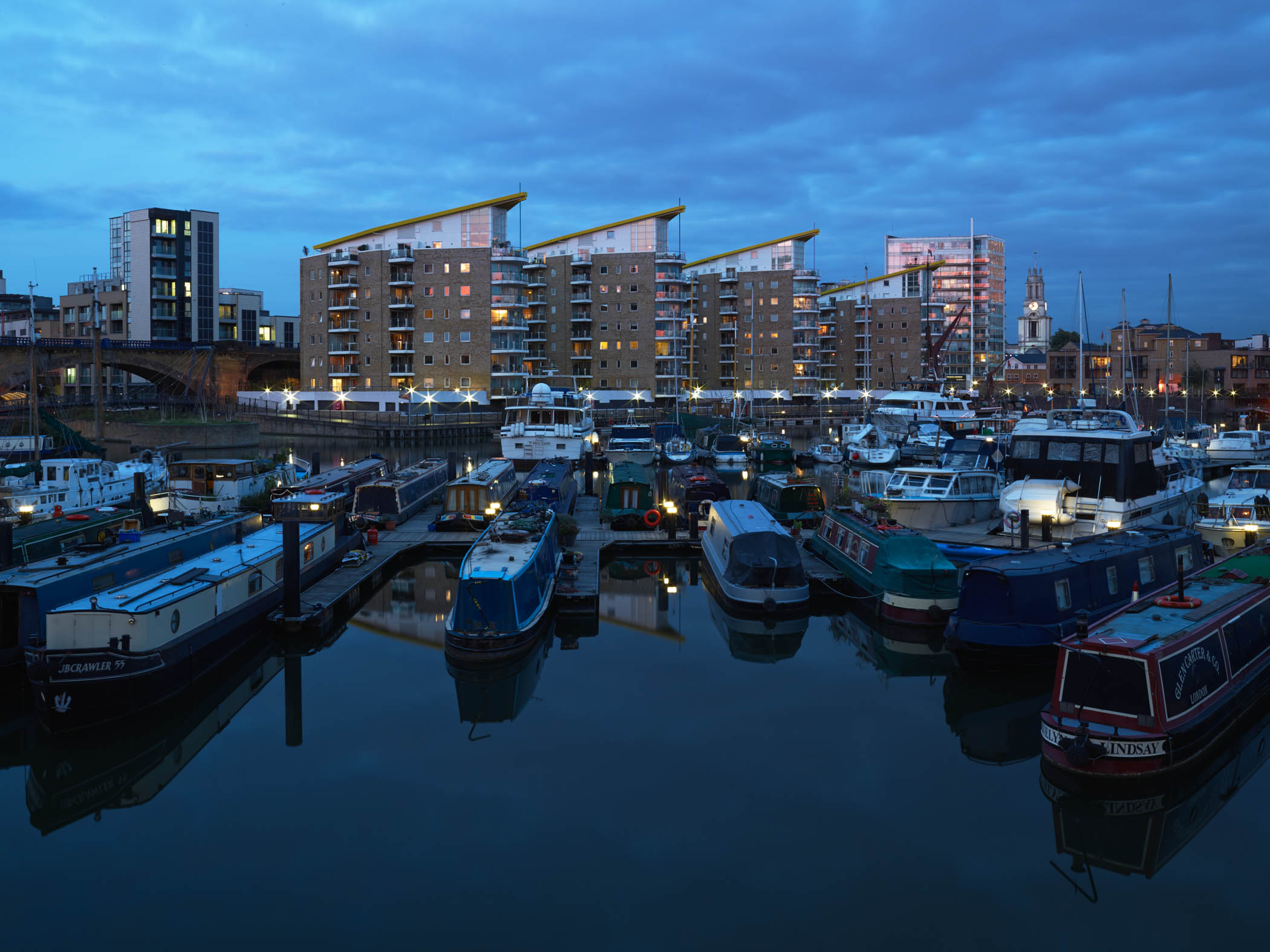 I returned later in the day and made two images in the twilight/night-time. My idea was to shoot the Limehouse Basin so that the water looked very dark, referencing the coal barges which used to fill the place… Here are the images: