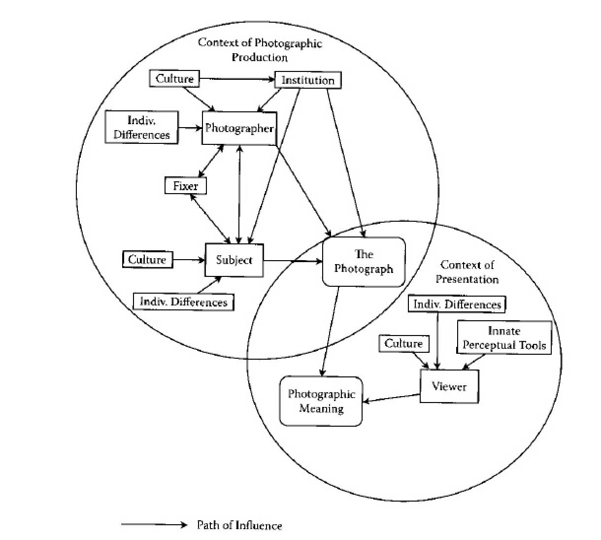 The photographer, subject, the interaction between them and the photograph itself are in the space which Mendelson calls the ‘Context of Photographic Production’. The photograph and viewer are in a space which he calls the ‘Context of Presentation’. This is the model he proposes: