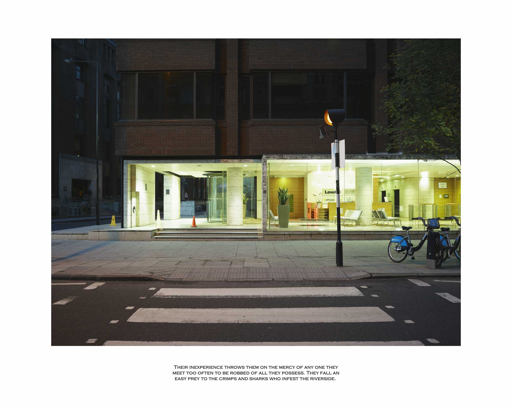 My sense is that viewers will really struggle to understand how this photograph of a modern day office block links to a comment about people falling prey to crimps and sharks. A small amendment to the text resolves this without, I hope, the text becoming too prescriptive and anchoring meaning.