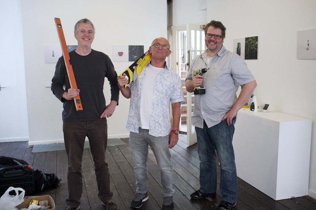 Nigel Haworth and Rob Briscoe handled the remainder of the installation including their own work and that of Dewald Botha (from China) and Tanya Ahmed (from New York). Nigel used conventional black wood frames with glass to show his work and Rob’s, Dewald’s and Tanya’s photographs were on foam core and were mounted onto the wall with velcro and battens. Some more images below:By just after 4 pm the work was done….onwards now to the Opening on Wednesday…. A final image of the installation team with their construction tools….