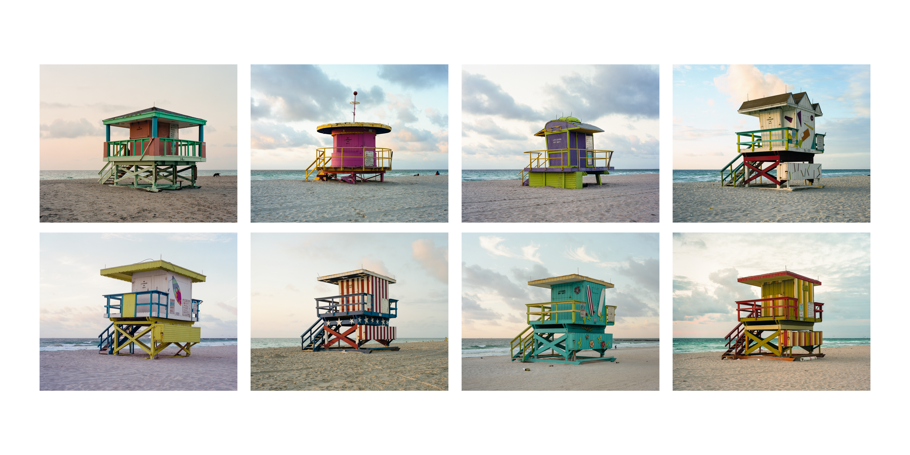 The life guard stations are a unique aesthetic attribute of South Beach and might be considered a bit of a cliche photographically. But by showing them as a grid with each station photographed using the same angle of view, composition, lens and so on I hope I have created something different. The work speaks to the diversity of South Beach, its creative spark, its colourful people and its reputation for fun. Many of the stations were rebuilt after Hurricane Andrew, and local architect William Lane helped redesign them.