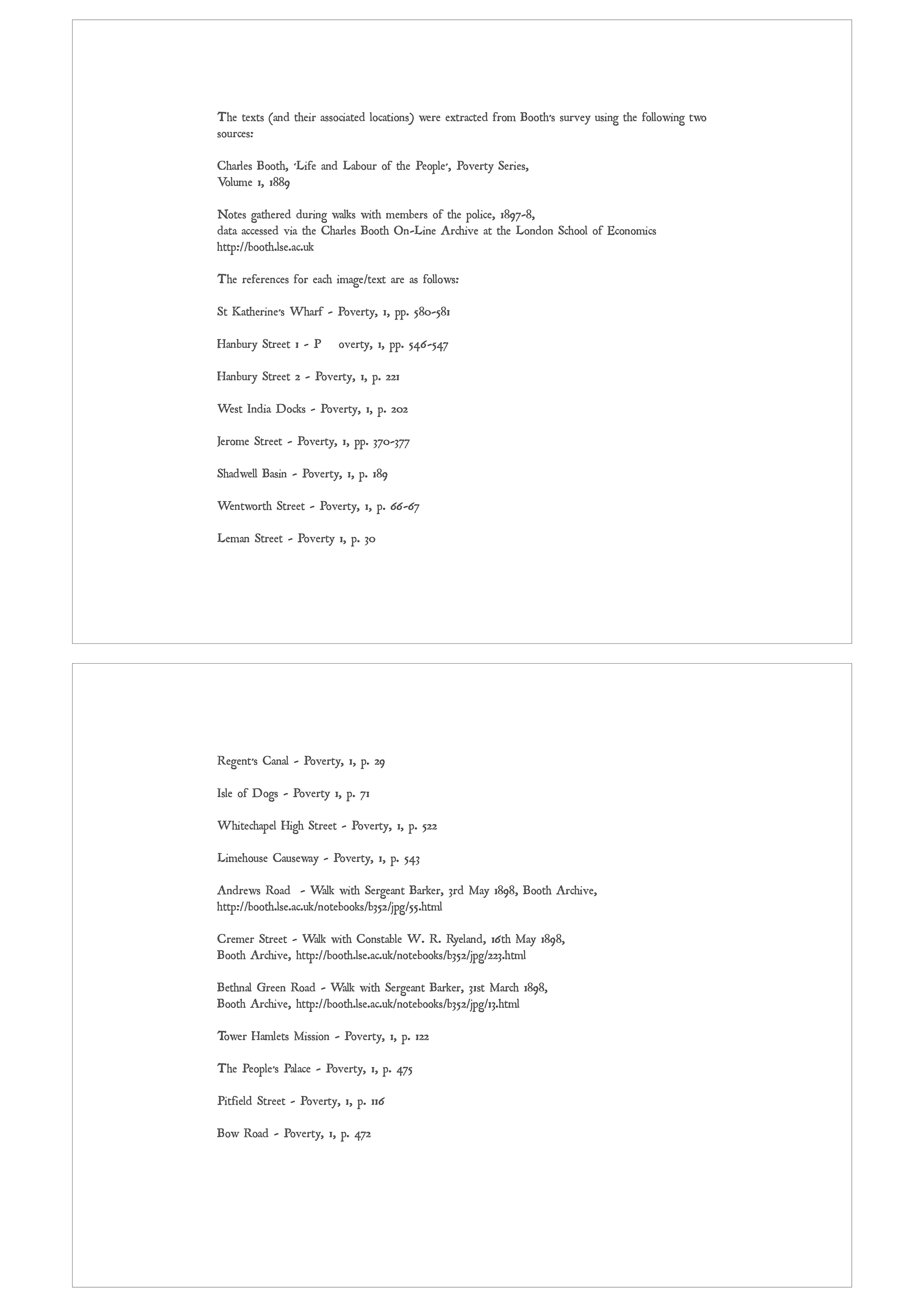 I have been mapping out (excuse the pun) how this would look in book format. Here are sample pages from a book layout. These pages would appear at the rear of the book. The references give the locations, the source of each text and shows the locations on both a modern day map and on Booth’s 1898-9 ‘Descriptive Map of London Poverty’. A key to interpret the poverty map is also given. The pages are presented in pairs which will be on facing pages in the book.