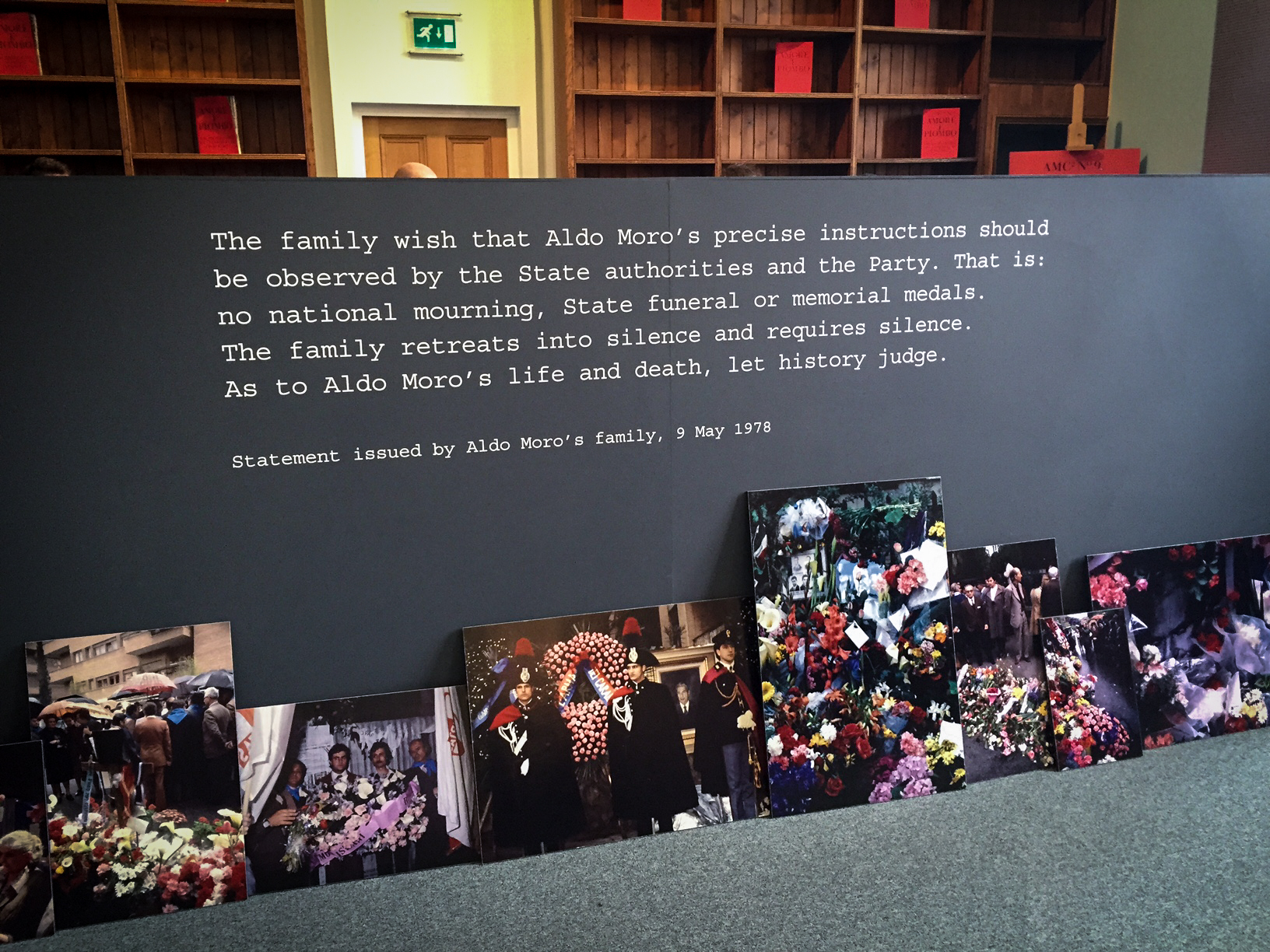 Another part of the installation which really captured my imagination was the way in which the photographs dealing with Alberto Moro’s funeral were displayed. Moro had said that when he died he did not want a memorial. The installation however went against his wishes and presented the photographs as a memorial. The photographs, which were in bright colour, were placed leaning against a low wall that looked like a stone wall carrying a memorial plaque. The subject matter of the photographs was directly referenced by the form of presentation, strengthening the message they communicated.