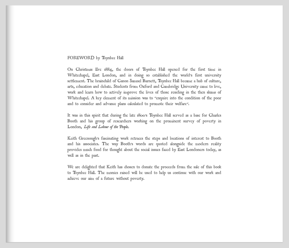 Throughout his survey Booth and his team used Toynbee Hall Settlement in Spitalfields, East London as their headquarters. Toynbee Hall is still going strong today and its vision remains ‘To eradicate all forms of poverty’. My plan is to link the presentation of my work to a fundraising effort for Toynbee Hall through sales of the book and exhibition prints. I would pay for the printing and book production and any funds raised would go to the Toynbee Hall charitable foundation. Toynbee Hall has agreed to work with me on this and have now written a foreword to the book (at the time of submission of the assignment they had yet to confirm the text of this). I have been very clear with them that using my work to as a fundraiser is in both their interests and mine. I hope to raise money for them and at the same time promote my work. The book also contains maps and text references printed with the permission of the London School of Economics Library where the Booth archive is maintained.