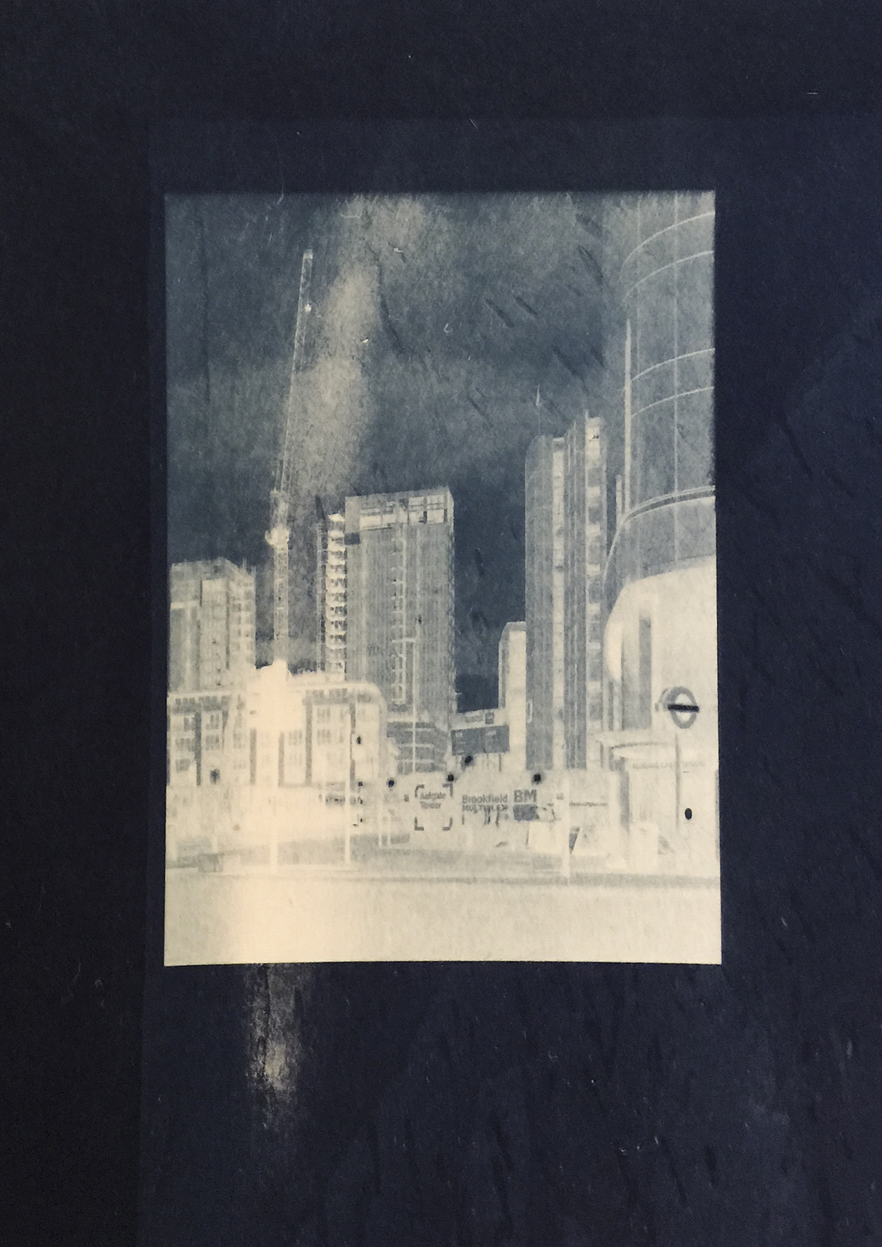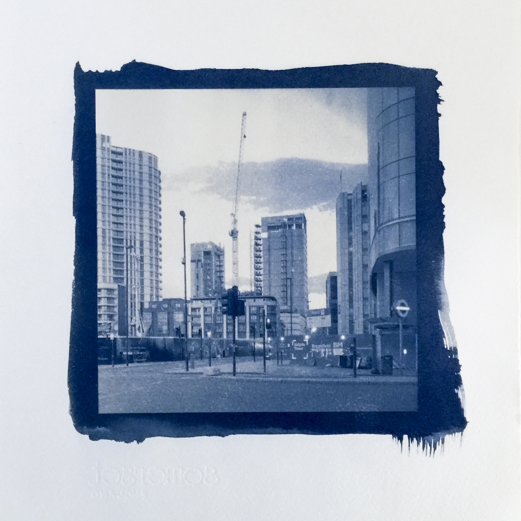 This quotation from Andrew Tallon who is a senior lecturer in Urban Policy at the University of the West of England provide much food for thought about how I might approach my project about the redevelopment and regeneration of East London. My idea would be to explore this dichotomy in some way. As I have mentioned elsewhere in this blog in exploring this subject I am interesting in using some form of traditional printing/processing to reference the past within the modern context of the subject of my images. On reflection it seems to me that the metaphoric impact of the mode of presentation could go much further than simply a reference to time. For example if I were to print the images as cyanotypes, I would implicitly be referencing the idea of the ‘blueprint’ or plan. Cyanotypes were for many years used by engineers as a means of copying their plans. Here are a couple of images of East London presented as somewhat crude (I’m learning) cyanotypes.